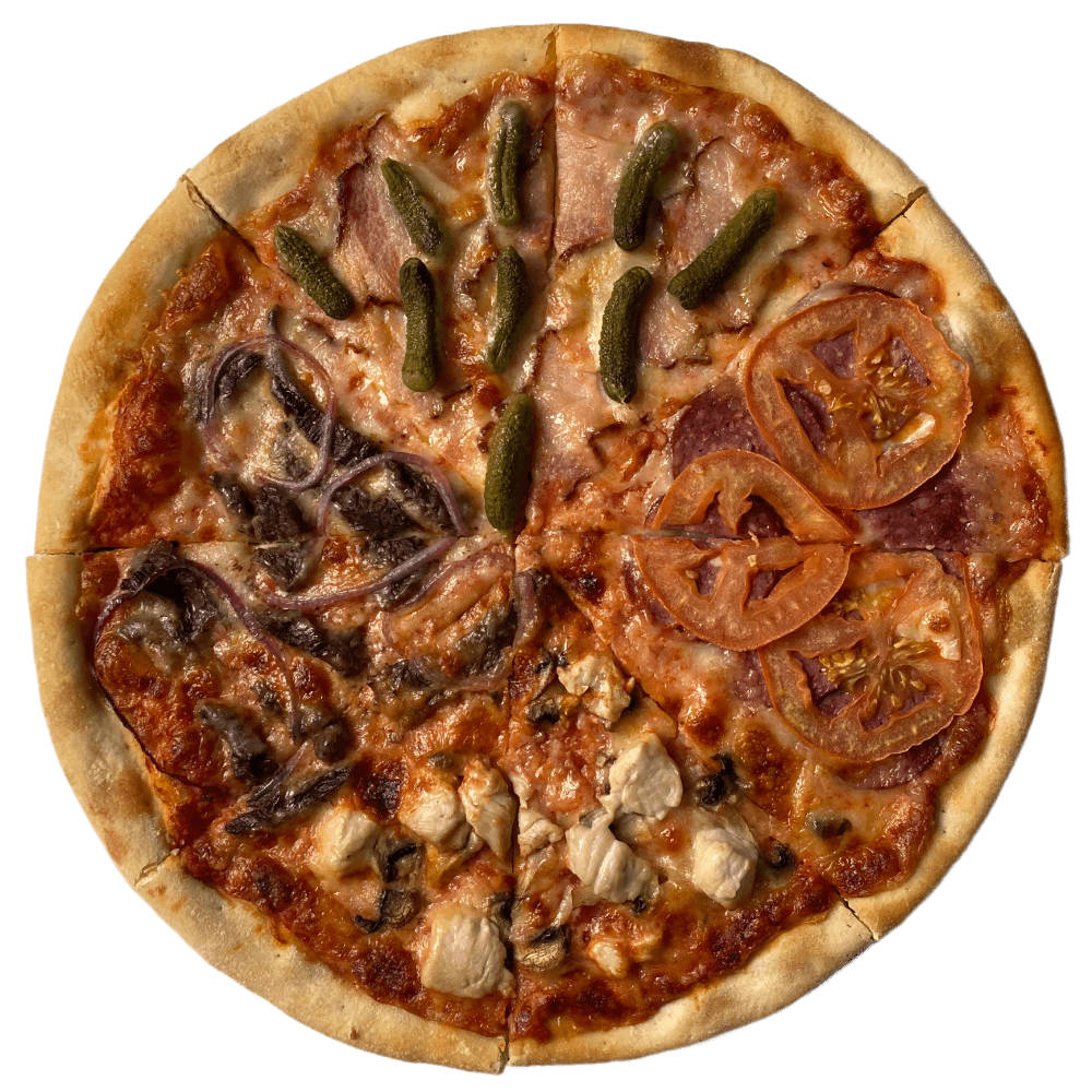 Склад: червоний соус, моцарела, телятина, маринована цибуля, бекон, мариновані огірки, салямі, помідори, куряче філе, шампіньони