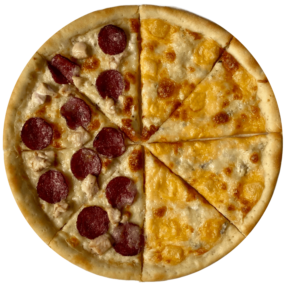 Склад: червоний соус, моцарела, пепероні, шампіньйони, куряче філе,  сир дорблю