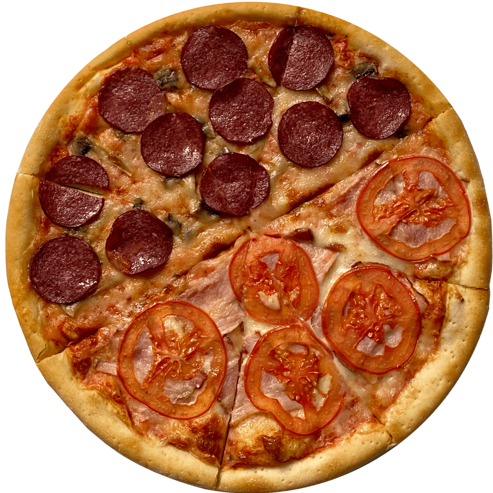 Склад: червоний соус, моцарела, салямі, печериці, бекон, помідор