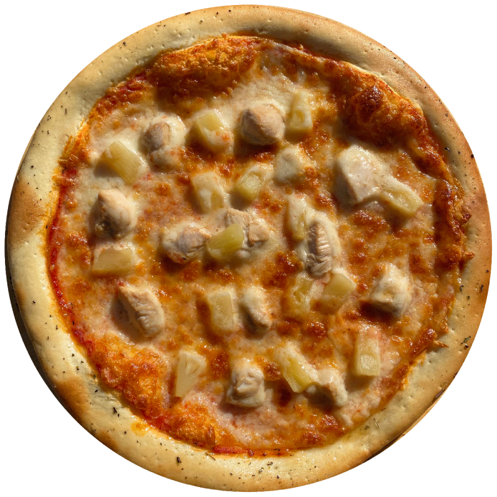 Склад: червоний соус, моцарела, куряче філе, шматочки ананасу
