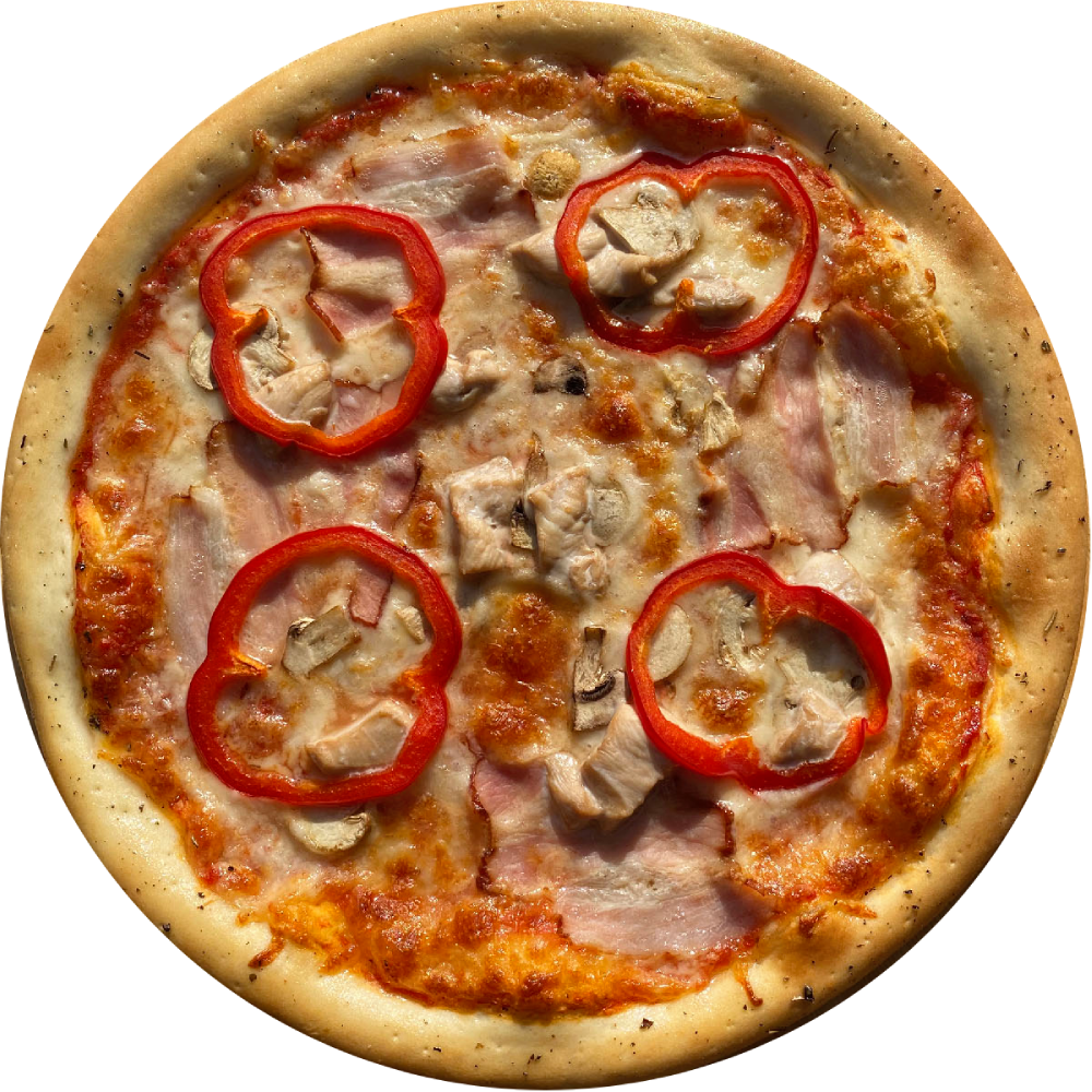 Склад: червоний соус, моцарела, куряче філе, бекон, солодкий перець, шампіньйони