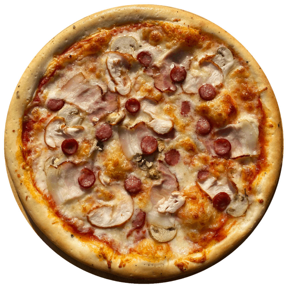 Склад: червоний соус, моцарела, шампіньйони, бекон, копчене кур. філе, мисливські ковбаски