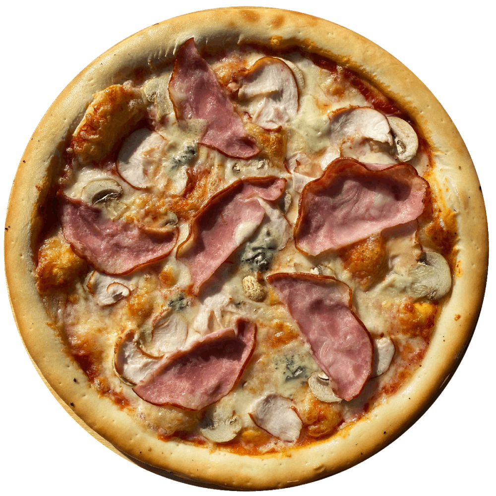 Склад: червоний соус, моцарела, дор блю, шинка, копчене кур. філе, шампіньйони, базилік (сезонна прикраса)
