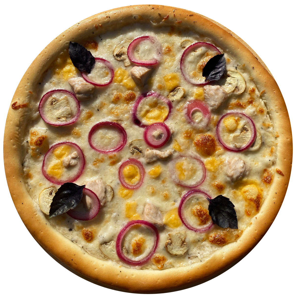 Склад: соус Бешамель, моцарела, гауда, куряче філе, шампіньйони, маринована цибуля, копчене куряче філе