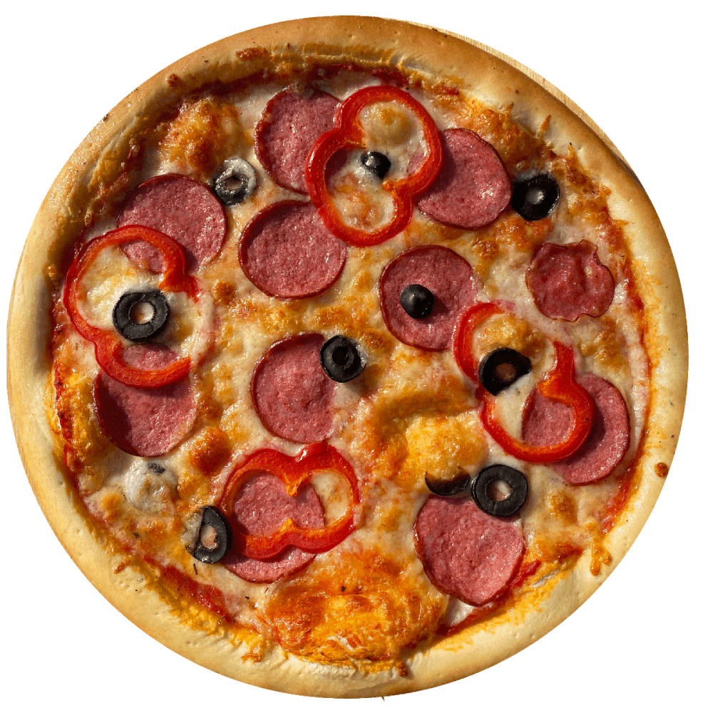 Склад: червоний соус, моцарела, салямі, шампіньйони, солодкий перець, маслини